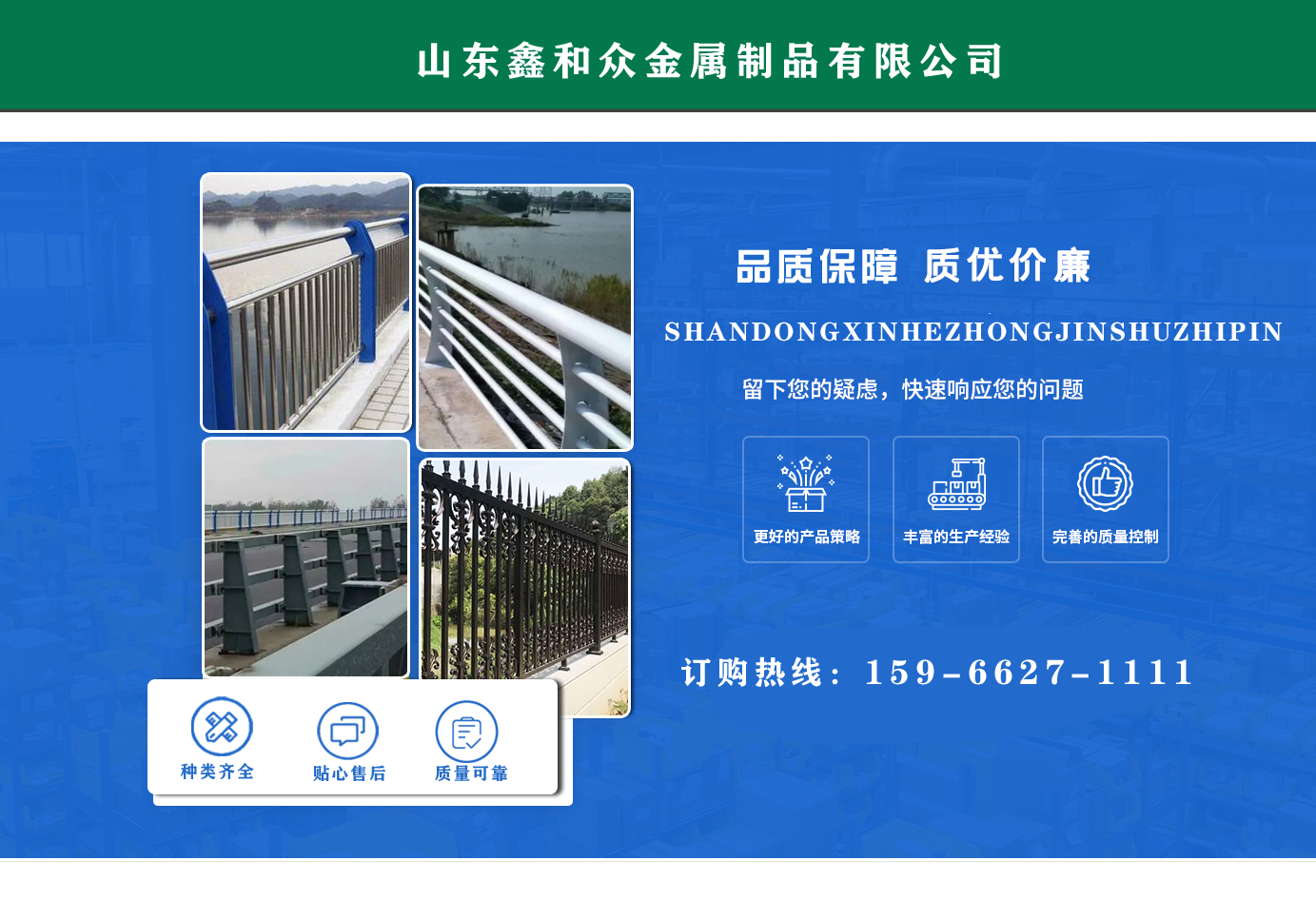 山東鑫和眾金屬制品有限公司主要產(chǎn)品有防撞護(hù)欄,橋梁護(hù)欄,道路護(hù)欄,河道護(hù)欄,不銹鋼護(hù)欄等護(hù)欄。提供設(shè)計(jì)方案,一站式定制,包您滿意價(jià)格優(yōu)惠,歡迎來(lái)電咨詢(xún)!    公司常年從事銷(xiāo)售護(hù)欄防撞護(hù)欄,橋梁護(hù)欄,道路護(hù)欄,河道護(hù)欄,不銹鋼護(hù)欄,橋梁鋼護(hù)欄,河道燈光護(hù)欄等。產(chǎn)品廣泛應(yīng)用于橋梁、河道、旅游景區(qū)、道路、公路、公園、小區(qū)、景觀、道路防撞等領(lǐng)域。    公司產(chǎn)品均采用優(yōu)質(zhì)不銹鋼材料,符合相關(guān)標(biāo)準(zhǔn)。各種型號(hào)不銹鋼復(fù)合管及護(hù)欄,質(zhì)量嚴(yán)格把控。產(chǎn)品強(qiáng)度高、耐腐蝕、焊接牢固、抗沖擊、性能好,防撞護(hù)欄結(jié)構(gòu)簡(jiǎn)單、美觀實(shí)用大方。     歡迎前來(lái)訂購(gòu)!...